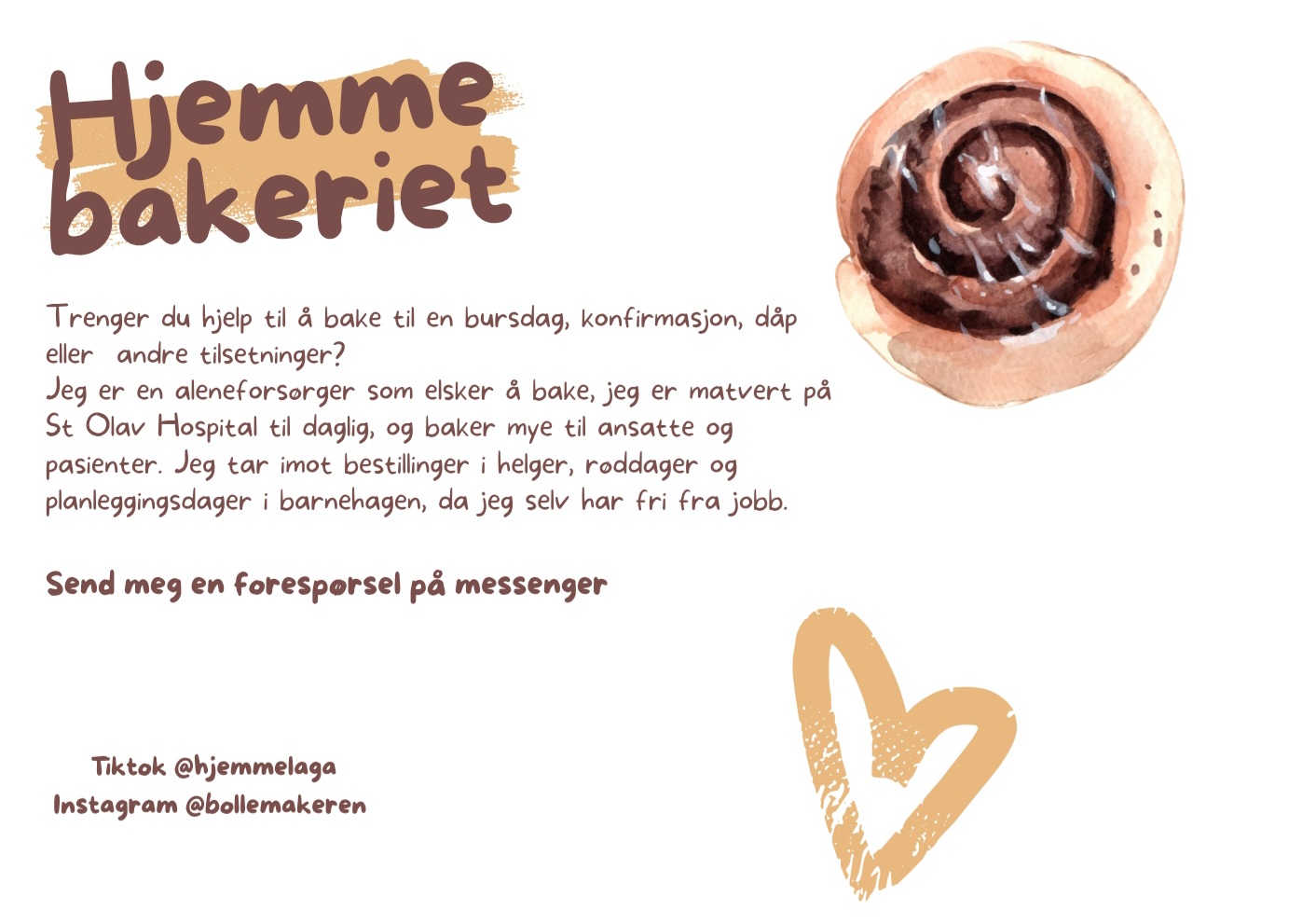 På mitt hjemmebakeri på Vikhammer spesialiserer jeg meg på gjærbakst og kaker. Jeg lager alt fra bunnen av og bruker norske råvarer så langt det lar seg gjøre. Jeg fokuserer på smak og saftighet, og har utviklet en gjærdeig som er utrolig digg, og som jeg tilpasser til kunden og fyllet en ønsker, for eksempel kanel og sukker, daim, sjokolade e.l mulighetene er uendelig.